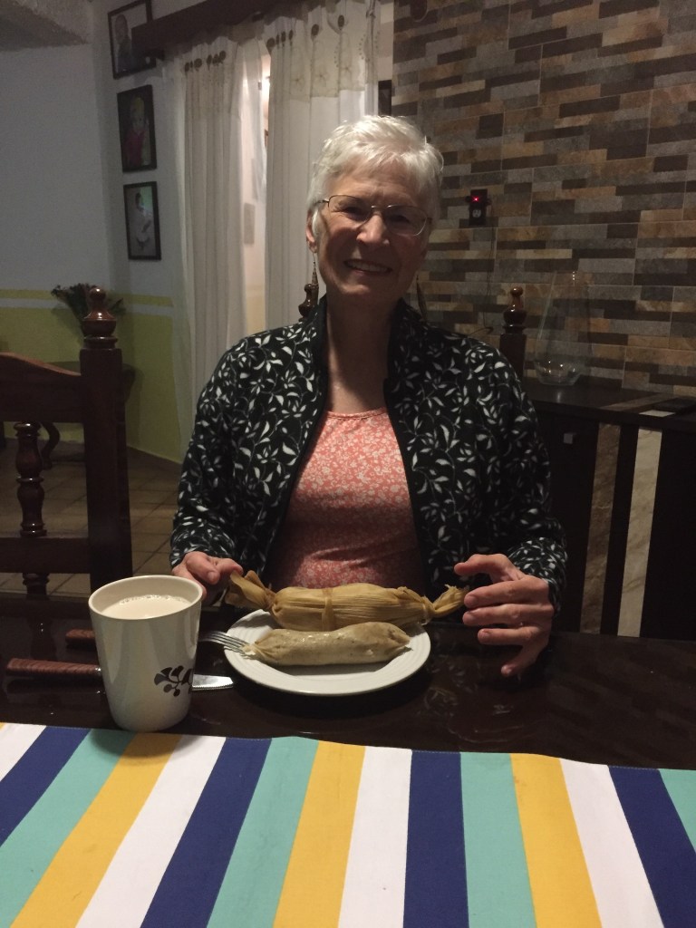 Tamali comes from the Náhuatl word “tamalli” which means “wrapped.” Náhuatl is one of the indigenous languages of Mexico. Tamales are made with corn dough, either plain or with meat, fruit or other ingredients added, then wrapped in a corn husk and steamed. I have been told by my neighbors that tamales are eaten because they are the traditional food from the time of the Aztecs. Besides eating tamales, we drink atole, which is a hot drink made from corn.